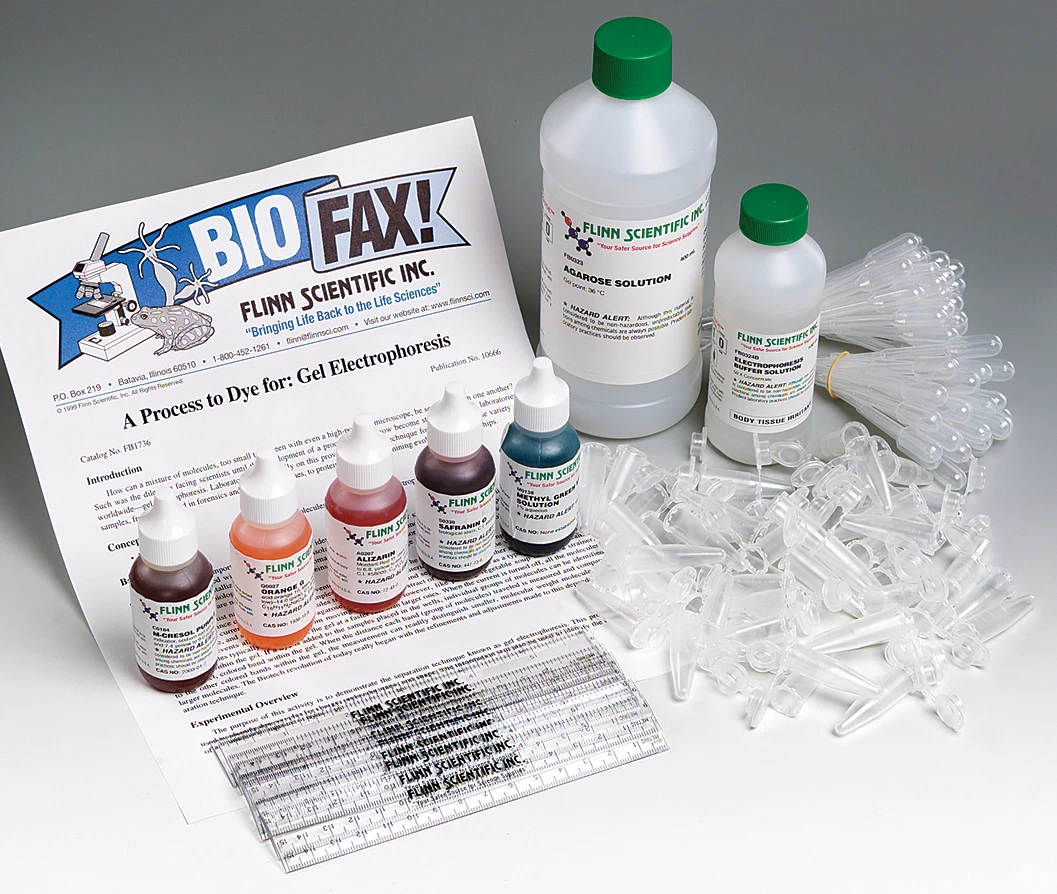 Introduce your students to the basic principles and operation of gel electrophoresis with this quick and easy experiment using colorful dyes. Students learn how biological molecules are separated during electrophoresis by comparing the charge, size and molecular formulas of five dyes. Students observe the direction and measure the rate of migration of the dyes and then use the results to identify an unknown mixture of dyes. The use of dyes eliminates the need for staining the samples, which means the entire process can be completed in one class period. Materials provided include agarose gel in a melt-and-pour bottle (sufficient to make 10 gels), TAE buffer, dye samples, microcentrifuge tubes, needle-tip pipets, and rulers, plus complete student and teacher instructions.