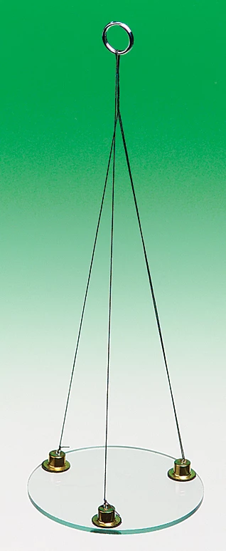 An impressive hands-on demonstration of adhesive surface tension. Hang the 7.5-cm glass disk by its three precisely coordinated hanging cords over a container of liquid. Then let the disk rest on the surface of the liquid. Students can feel the force required to pull the disk free. For quantitative results, a spring scale can be used to measure the actual force and compare it to the weight of the disk alone. Different liquids can also be compared to determine their adhesive surface tension.