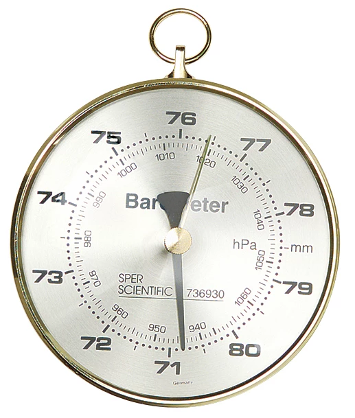 Non-mercurial, dial-type barometer with a dual range scale. Range is 940 to 1070 millibars or 710 to 800 mm of mercury with an accuracy of ±3 to 4 millibars. Instrument can be wall mounted. 4″ dial is easy to read from a distance.