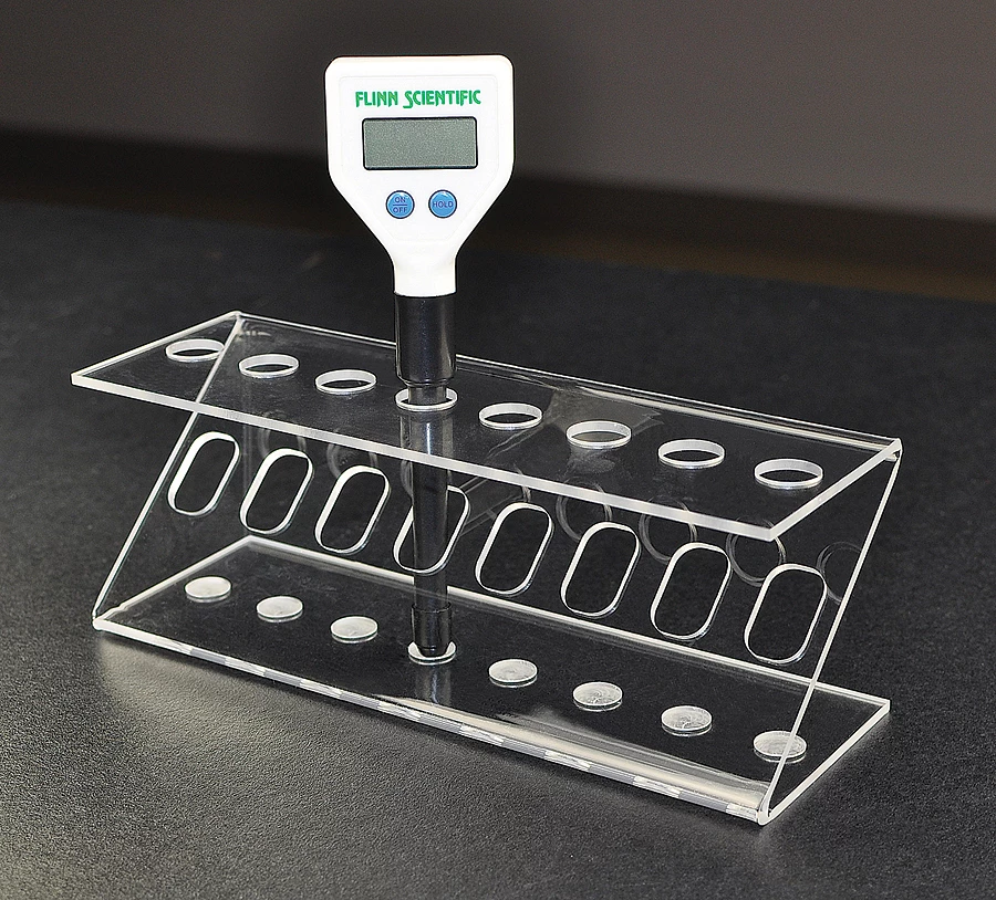 An acrylic, eight-place rack for storing your electrodes inside test tubes that contain buffer solutions or other storage solution. Storing your electrodes in a storage solution will prepare them for immediate use or stabilize them if they are used infrequently. 9″ long x 3″ deep x 3¼” high.
