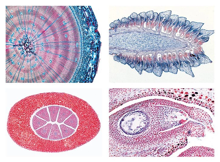 ⢠Pinus, pine, wood, transverse, radial and tangential sections