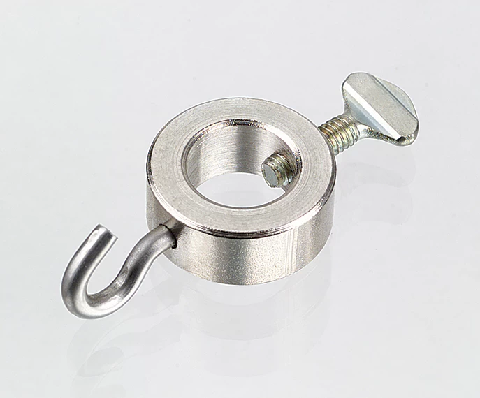 Nickel-plated collar with thumbscrew and hook. Useful for attaching or suspending apparatus from support rods. Available in two sizes.