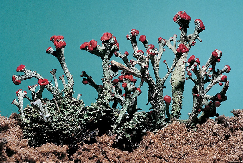 Most often mistaken for plants, lichens actually represent complex symbiotic associations between algal and fungal species. Notable as pioneer species in the process of ecological succession and as residents of environments that few other organisms can tolerate. Although they seem to thrive under inhospitable conditions, lichens are highly susceptible to pollution and are often seen as natural indicators of air quality. Set includes examples of the three most common morphological types of lichens: foliose, crustose and fruticose. Species vary.