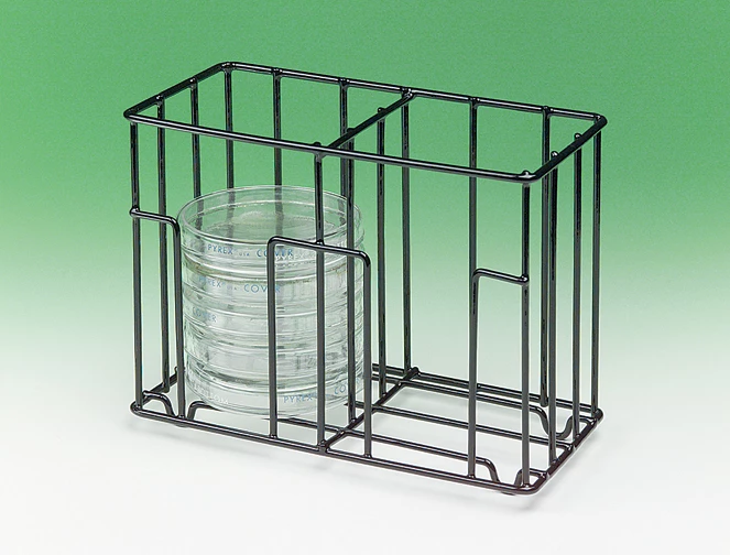 Neoprene-coated wire holder. Should easily handle incubation, sterilization and refrigeration. Will accommodate 18 dishes. Dimensions of rack: 9-1/16″ W x 4â ” D x 7â ” H.