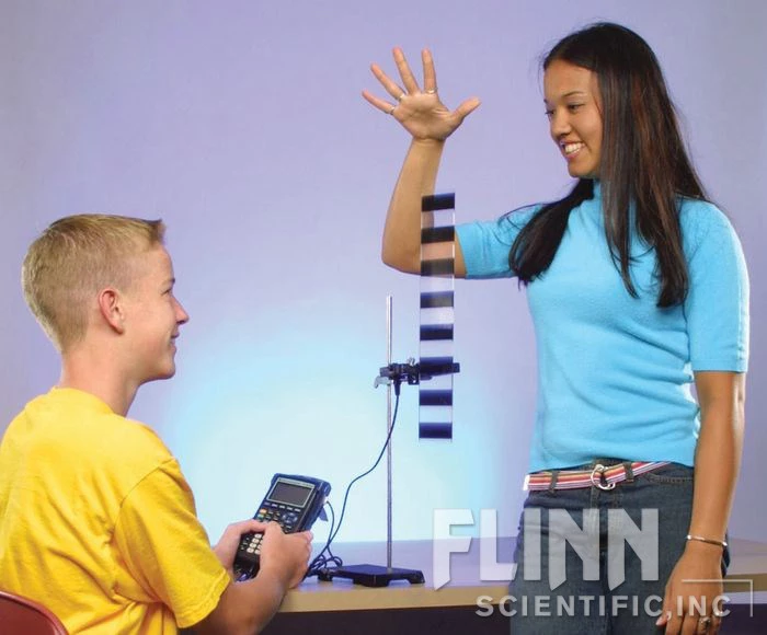 A picket fence is used for free-fall experiments with products like the PSWorks Photogate Timer (Catalog No. AP6998) and advanced laboratory kits like Measuring g: Exploring Free-Fall (Catalog No. AP7722).