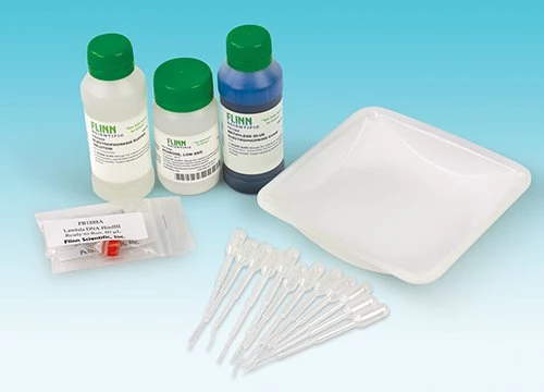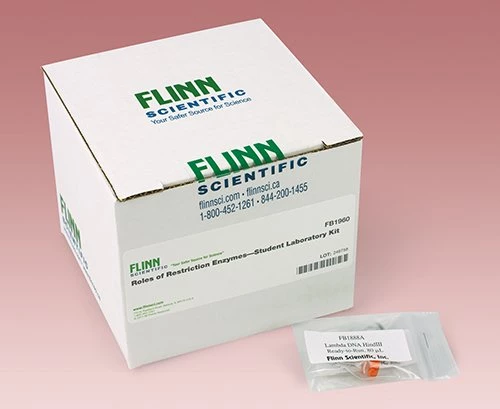 Get a peek at restriction enzymes in action! Restriction enzymes recognize and cut DNA at specific sequences. First, students simultaneously run two identical DNA samples, one cut with EcoRI and the other cut with HindIII, using gel electrophoresis. Then the banding patterns produced are analyzed to see how the use of different restriction enzymes results in changes in the number and size of the bands. This lab helps students understand the theory of how restriction enzymes digest DNA. It also enhances laboratory skills such as preparing an agarose gel, loading and running DNA samples, and staining and destaining the gel to observe the separated bands of DNA. Perfect combination of theory and practice! Contains enough materials for a class of 24 students working in groups of four. Materials provided include sufficient agarose to make 6 gels, DNA samples cut with EcoRI and HindIII, respectively, TAE buffer, methylene blue for staining the gel, as well as needle-tip pipets and large weighing dishes. DNA source is Lambda phage.The DNA contained in this kit must be kept frozen prior to use. Orders will only be shipped between September 15 and May 15 unless we are told otherwise. Upon receipt, this kit should be stored in the freezer until just before it is to be used.