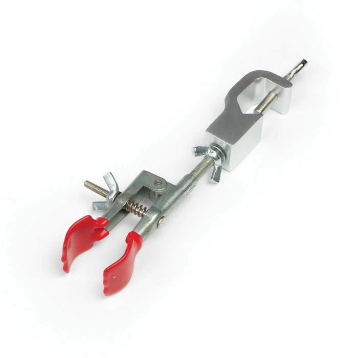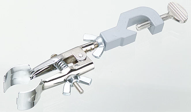 Inexpensive buret clamps of stamped steel. The clamp portion is made of zinc-plated iron. Will accept tube-type objects from 3/8″ to 1-3/8″ in diameter. Clamps are available in two forms: plain jaw or plastic-coated jaws.