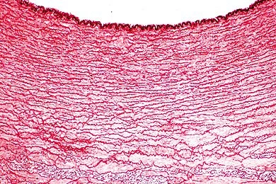 sec. Verhoeff’s elastic tissue stain, compare to vein preparation below for thickness of muscle layer and proportion of elastic tissue in that layer.