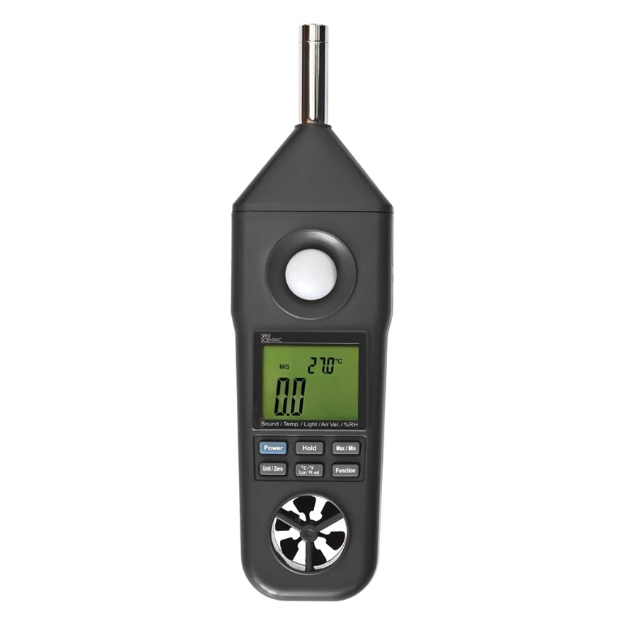 Measure air speed, air temperature, humidity, light, sound and thermocouple temperature all in one unit! This handy meter combines an anemometer, hygrometer, thermometer and sound and light sensors all in one handheld device. Results are displayed on a large dual LCD with low-battery and out-of-range indications. Features touch-tone buttons, min/max, auto power-off and hold functions. Comes ready to use in a soft carrying case with instructions, 6 AAA batteries, easel back and a tripod screw. N.I.S.T. traceable certificate of calibration available for sound only.