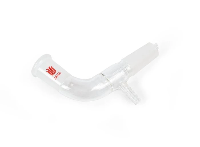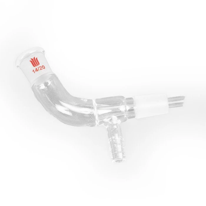 Organic chemistry glassware. This short stem take-off adapter is bent with a drip tip. It can be used to connect a condenser to a flask for vacuum distillation. The adapter is high-quality borosilicate glass. Instructions and illustrations for setting up organic glassware for a variety of procedures, such as reflux and simple vs. fractional distillation, are available in the PDF above under Resources.